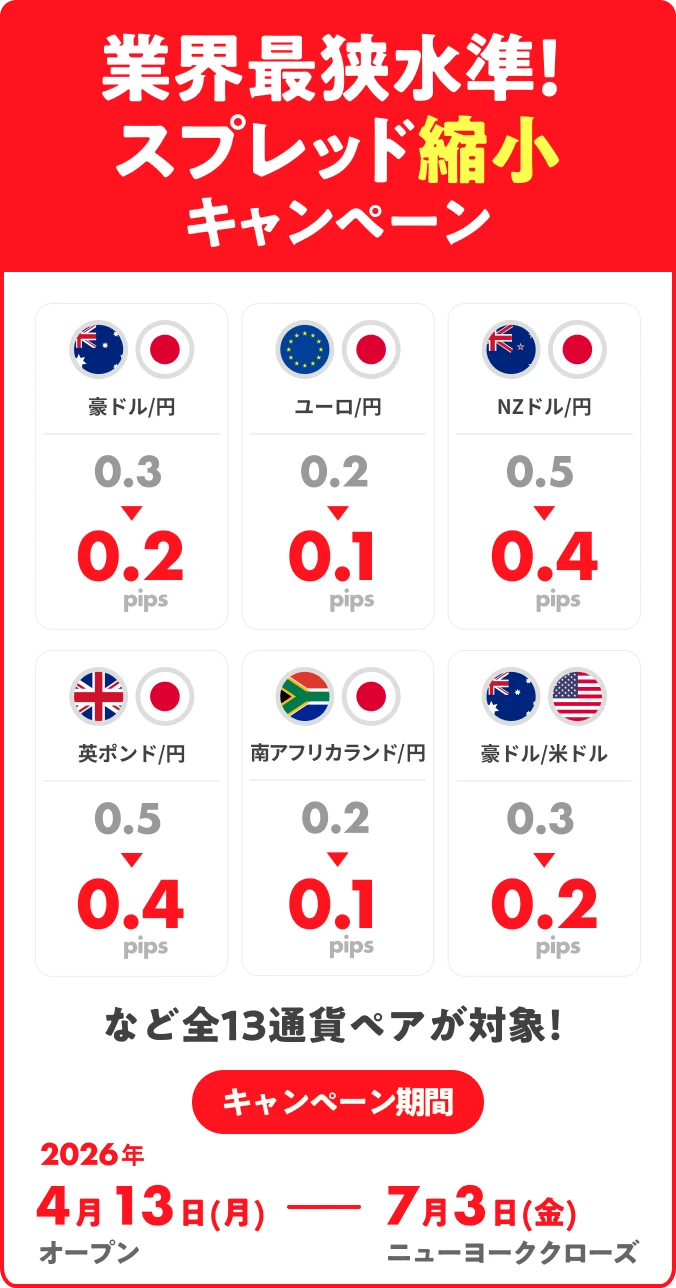※スプレッドは固定化されたものではありません。相場状況の急変・指標発表後、もしくは早期やその他の外部要因などにより拡大する場合があるため、発注時点に比べ不利な価格で約定する場合があります。また、市場の流動性の低下などの理由により約定しない場合があります。