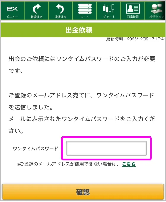 メールを確認のうえ、ワンタイムパスワードを入力してください。